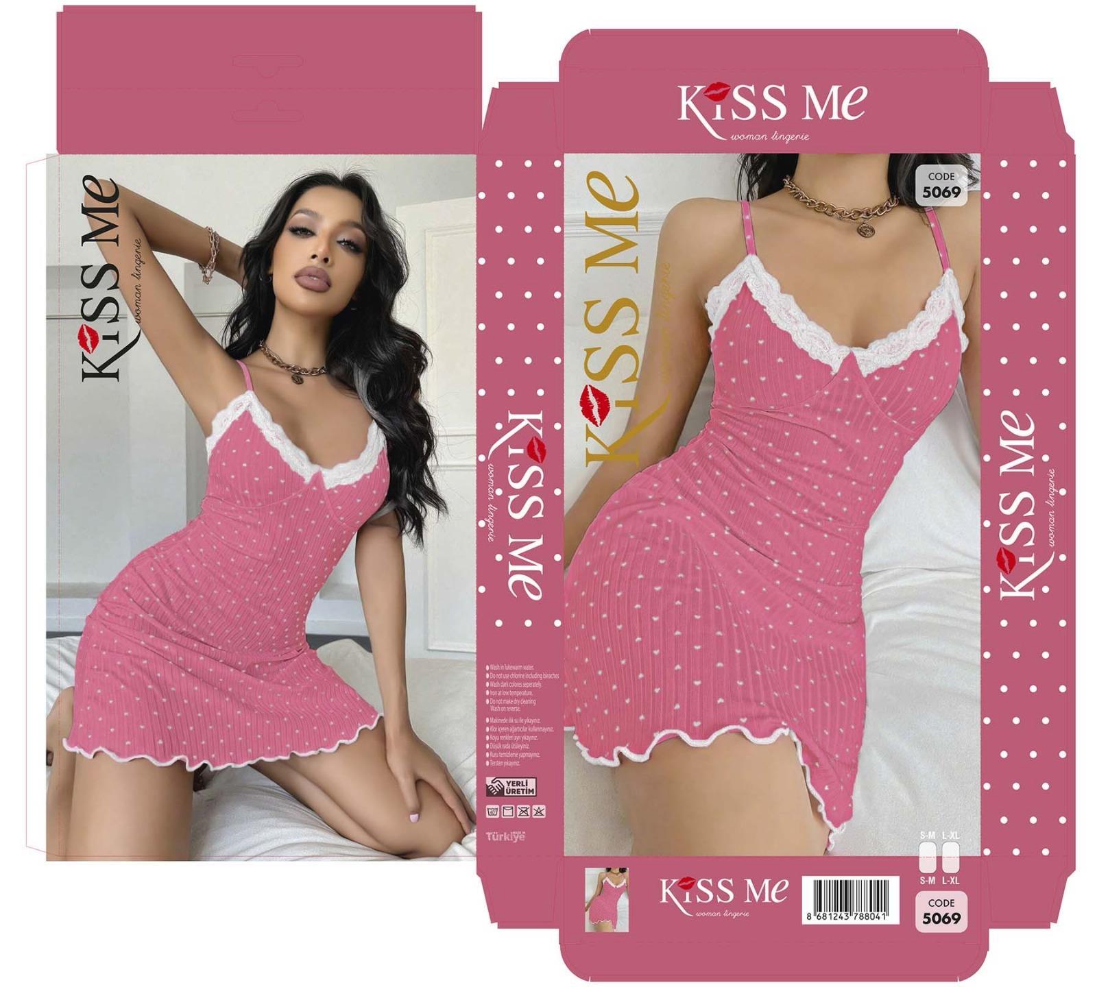 Kadın Fuşya Beyaz Kalp Desenli Askılı Dantel Detaylı Elbise 5069